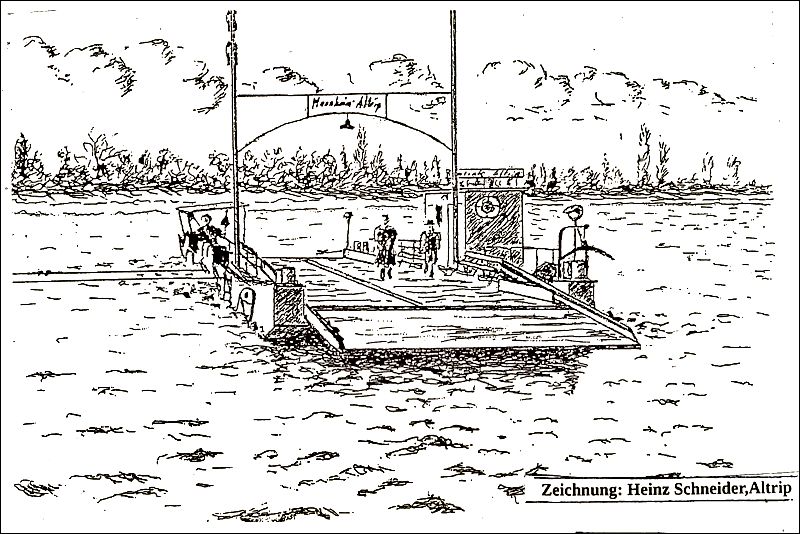 Die Altriper Gierfähre (Zeichnung: Heinz Schneider)Der Fährmann, damals Ferge genannt, war Wind und Wetter ausgesetzt und schaffte es oft nur schwer, punktgenau über den Rhein zu setzen, da ihm die Strömung sehr viel Kraft abverlangte. 1909 baute der Altriper Bürgermeister Michael Baumann die Fähre auch für den Fuhrwerks- und Wagenverkehr um. Allerdings war für beladene Fuhrwerke an den steilen Auf- und Abfahrten ein „Vorspann” durch Zugtiere notwendig.